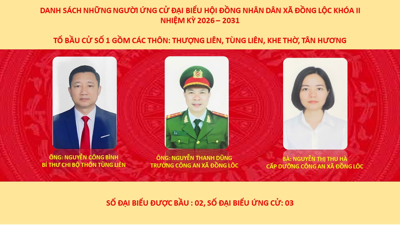 DANH SÁCH NHỮNG NGƯỜI ỨNG CỬ ĐẠI BIỂU HỘI ĐỒNG NHÂN DÂN XÃ ĐỒNG LỘC KHÓA II NHIỆM KỲ 2026-2031.Ẩn danh27/02/2026A -A+Ẩn danh27/02/2026A -A+ ĐƠN VỊ BẦU CỬ SỐ 1 GỒM CÁC THÔN: THƯỢNG LIÊN, TÙNG LIÊN, KHE THỜ, TÂN HƯƠNG SỐ ĐẠI BIỂU ĐƯỢC BẦU: 02, SỐ ĐẠI BIỂU ỨNG CỬ: 03 ÔNG: NGUYỄN CÔNG BÌNH, BÍ THƯ CHI BỘ THÔN TÙNG LIÊN ÔNG: NGUYỄN THANH DŨNG, TRƯỞNG CÔNG AN XÃ ĐỒNG LỘC BÀ: NGUYỄN THỊ THU HÀ, CẤP DƯỠNG CÔNG AN XÃ ĐỒNG LỘC