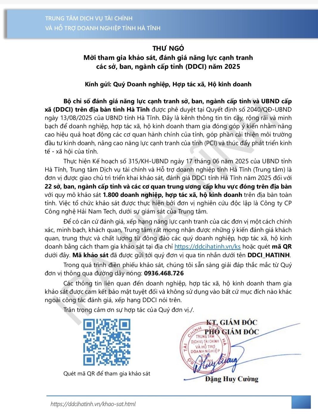 Các quý doanh nghiệp, hợp tác xã, hộ kinh doanh bằng cách tham gia khảo sát tại địa chỉ https://ddcihatinh.vn/ks hoặc quét mã QR