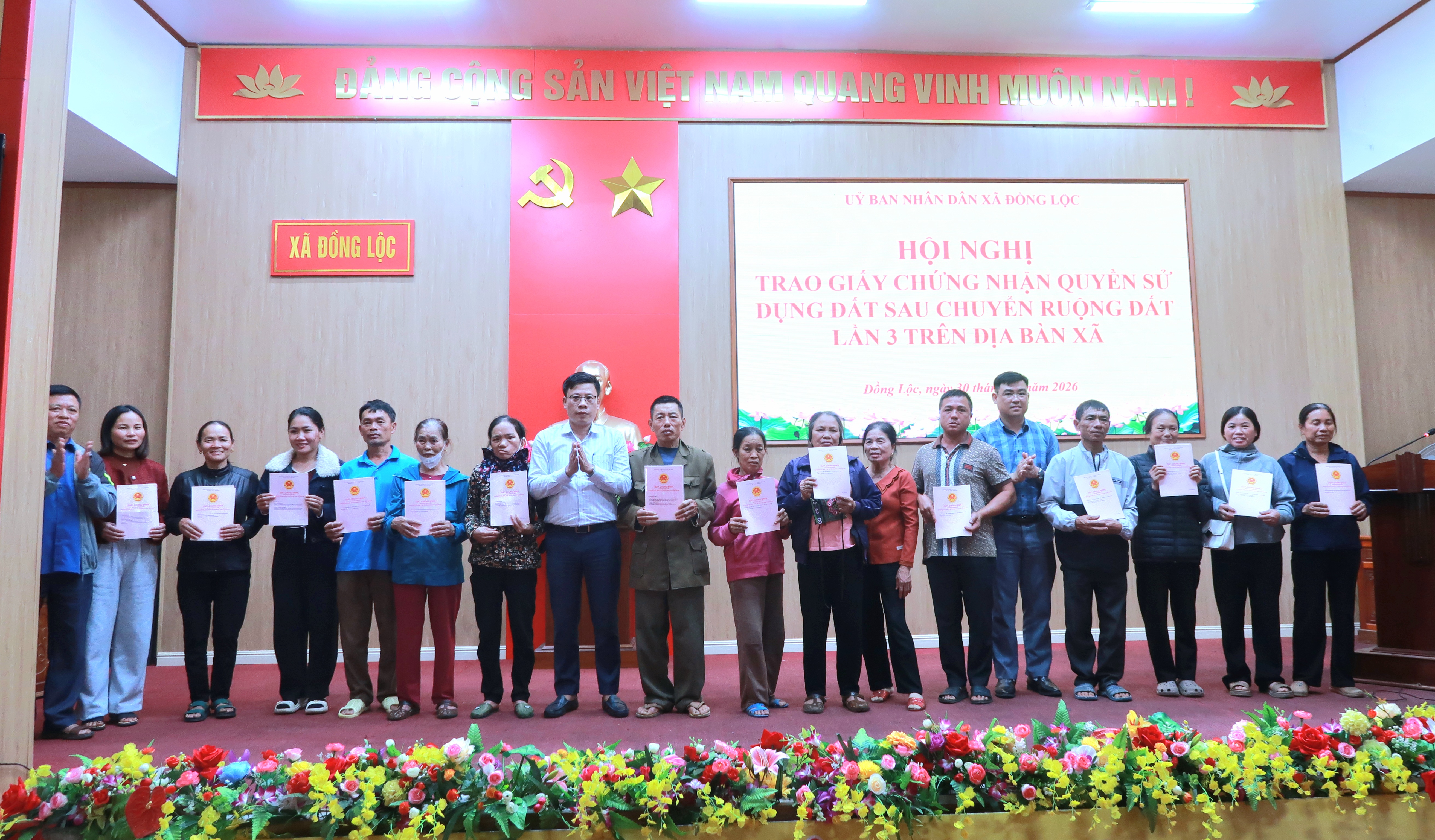 Phát biểu tại buổi trao giấy, đồng chí Phan Anh Đức – Phó Chủ tịch UBND xã Đồng Lộc cho biết, trong đợt chuyển đổi ruộng đất lần 3, xã hỗ trợ 100% kinh phí đo đạc và in ấn hồ sơ cho 183 hộ dân thuộc 3 thôn Minh Tân, Đồng Kim, Cồn Soi nhằm giải quyết dứt điểm các tồn đọng về đất đai. Việc chuyển đổi hướng tới mục tiêu thực hiện Nghị quyết 06 của Tỉnh ủy, phấn đấu đa số hộ dân chỉ còn 1 thửa ruộng để thuận lợi cho cơ giới hóa và sản xuất quy mô lớn.